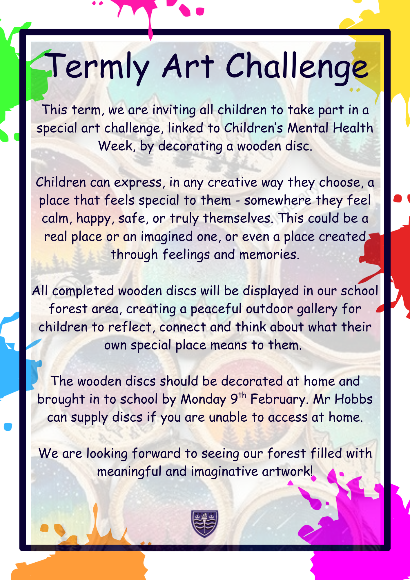 February 1st, 2026 A reminder of this term's Art Challenge which links with Children's Mental Health Week. Completed wooden discs ...