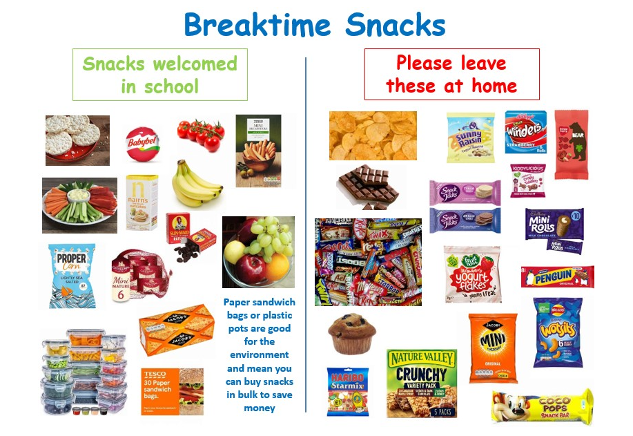 We would like to encourage pupils to bring in a healthy snack at break time. This can help maintain stable blood sugar levels and improve mood, energy, ability to focus and concentrate and regulate behaviour in the classroom. Suitable drinks and snacks also help prevent tooth decay and help to meet the recommended target of five or more portions of fruit and vegetables a day. Ideas of snacks to bring in for BREAK TIME are: a piece of fruit, vegetable sticks, bread sticks, raisins, juice cartons, rice cakes, yogurt tube, cheese cubes or malt loaf.