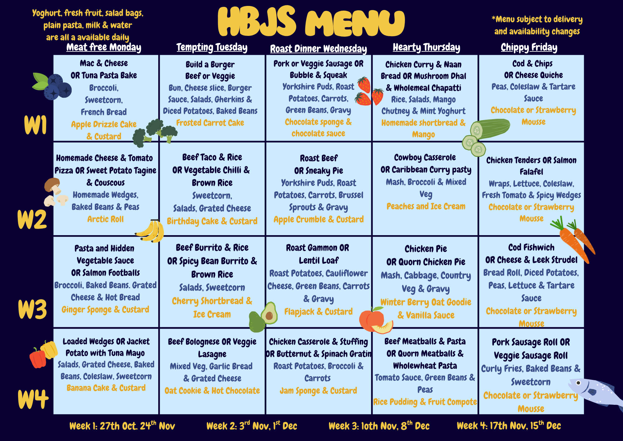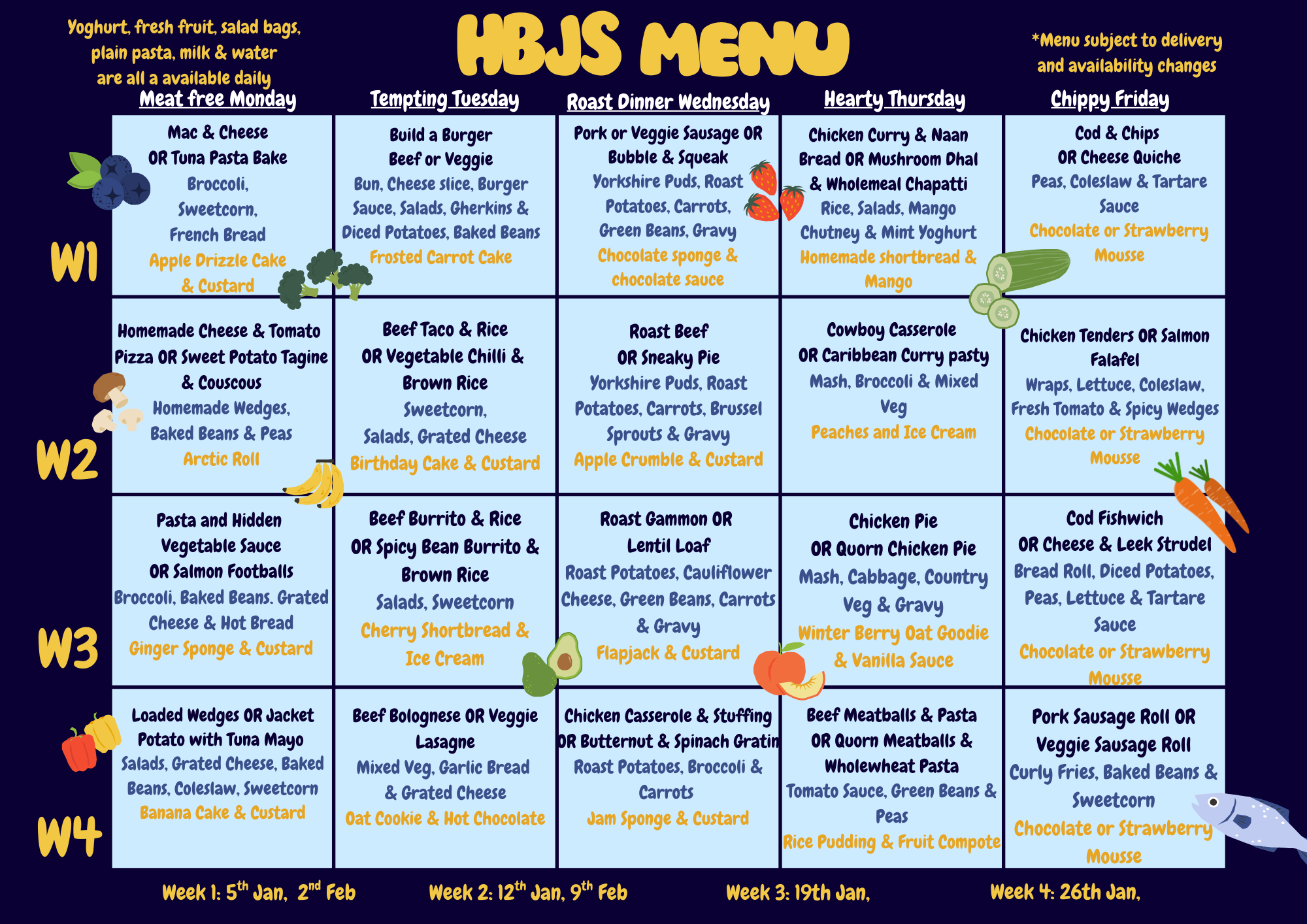 Some of our menu items contain allergens, such as milk, eggs, gluten, fish, shellfish, celery, soya, mustard, sulphites, sesame and lupin. Peanuts and nuts are also classed as allergens, but these are not used on our menus. If you have any concerns or would like any further information please contact the school office.